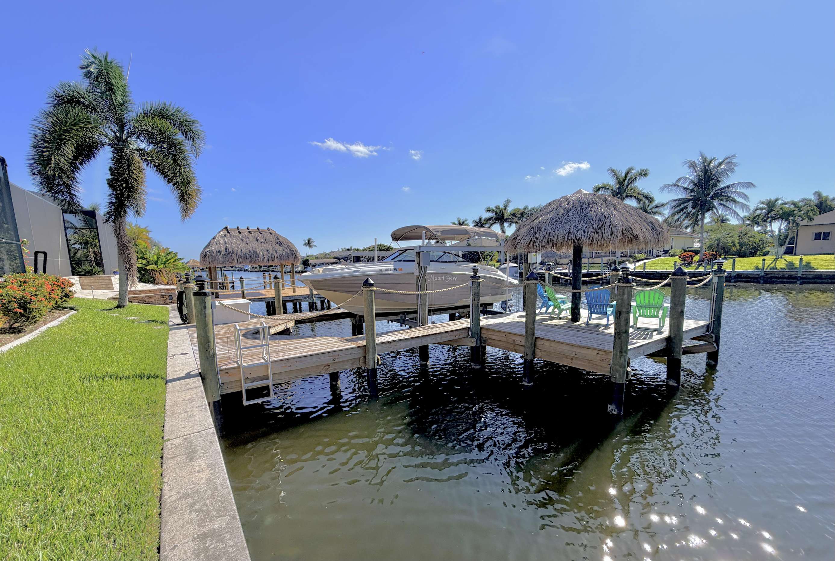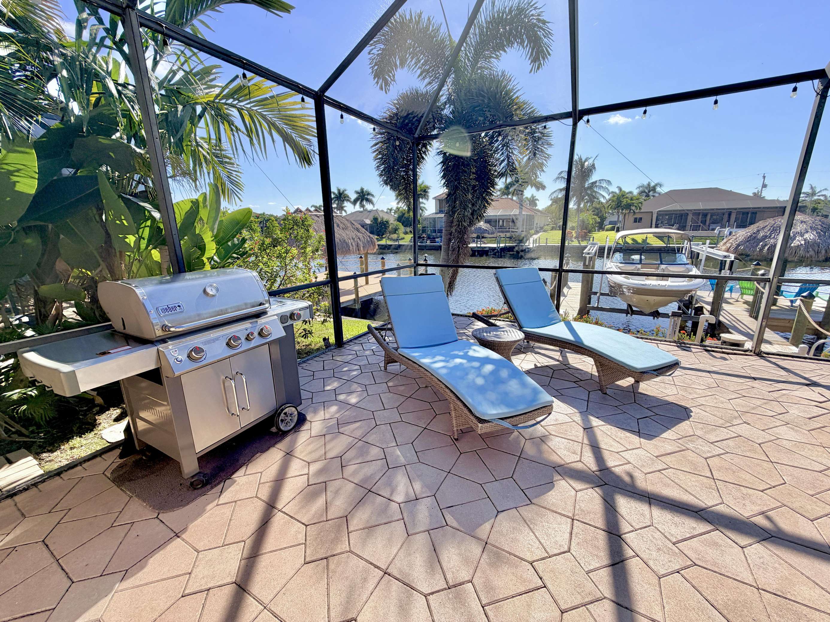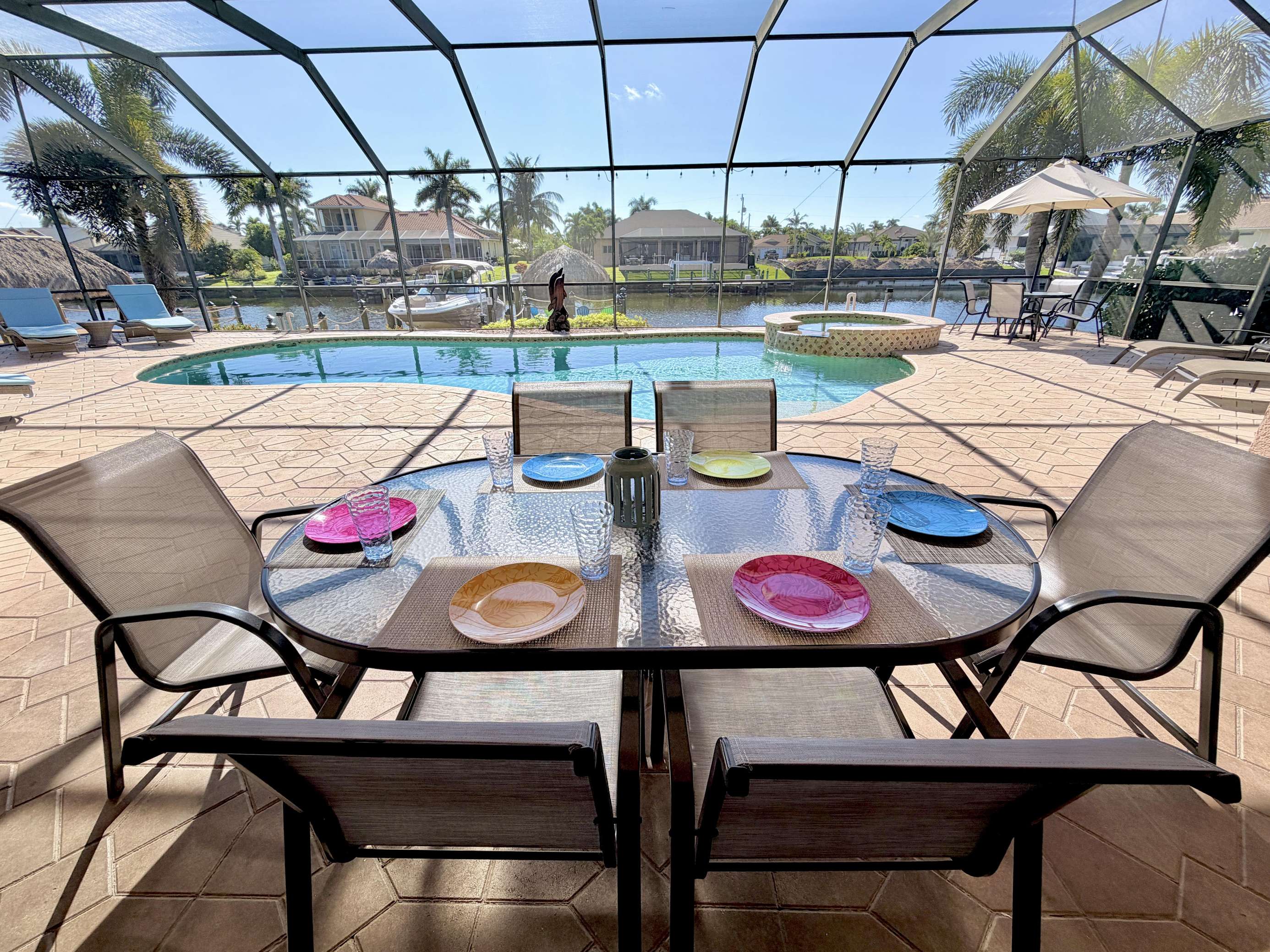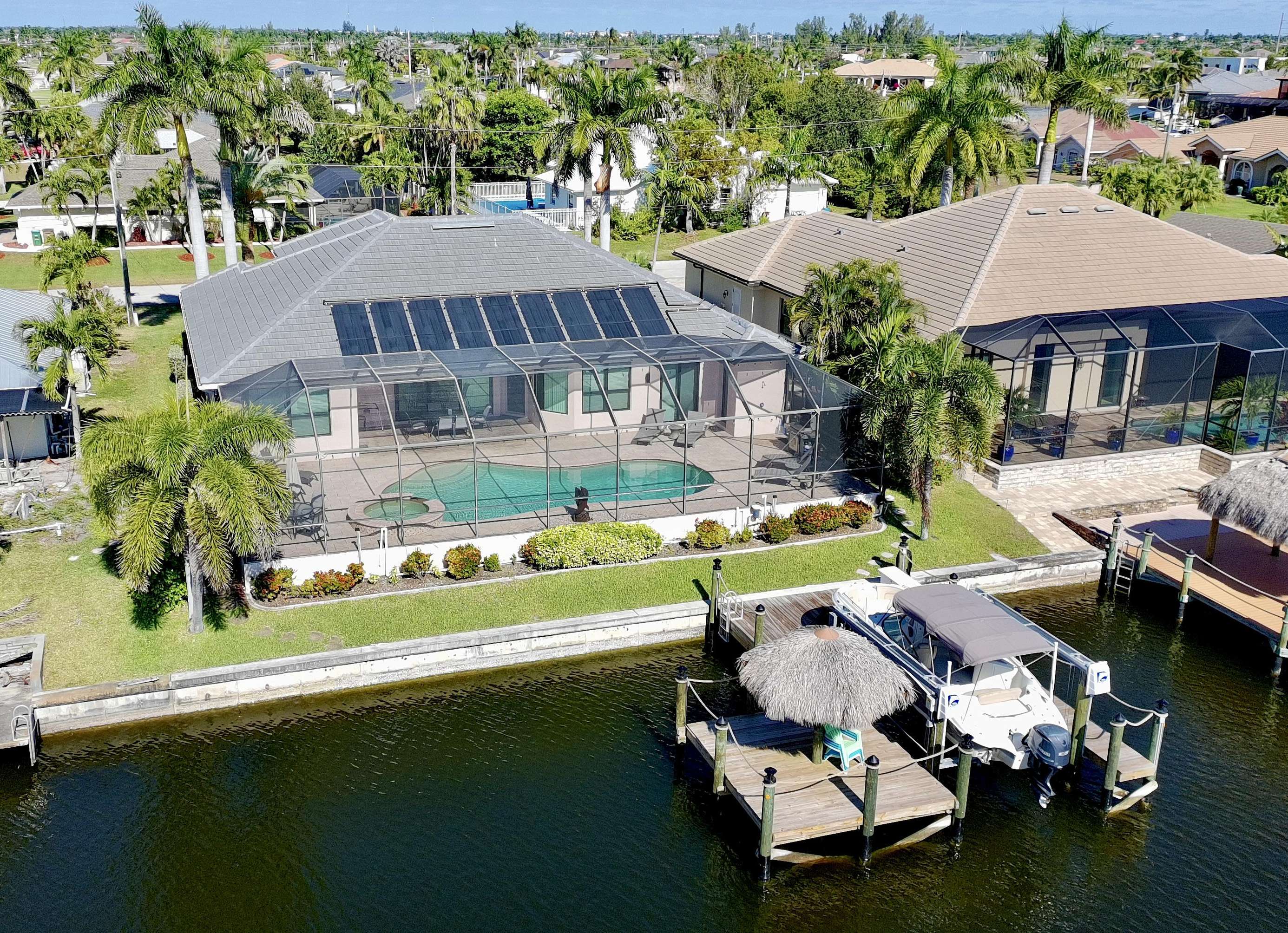 Welcome to Villa Mauritius, a sprawling estate on a beautifully landscaped lot with southern exposure! This spacious home is tastefully equipped and appointed to assure you have a wonderful stay. The screened-in, sun-filled porch with its large, heated saltwater pool and spa is everyone's favorite spot day and night. There is a beautiful dock inviting everyone to enjoy those world-renowned Florida sunsets right down the wide waterway. Make it truly a Cape Coral vacation and rent the powerboat with the house! A licensed Captain will provide a thorough instruction so you will enjoy every day on the water and bring home priceless memories. Please just call and inquire!