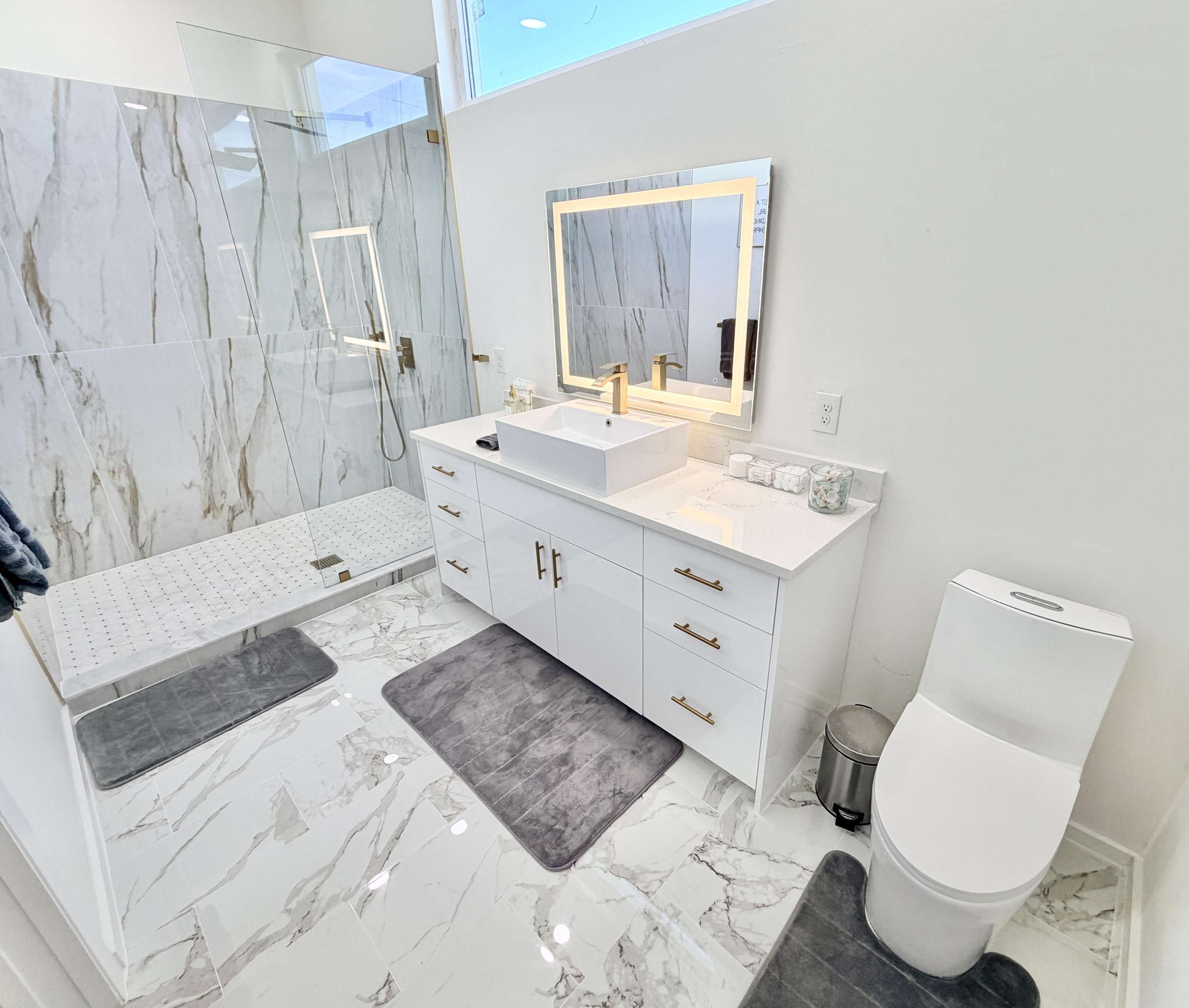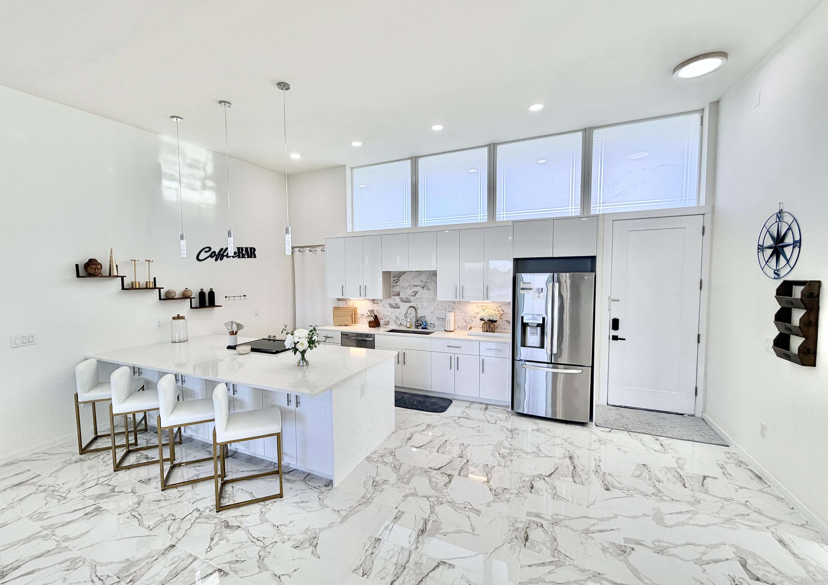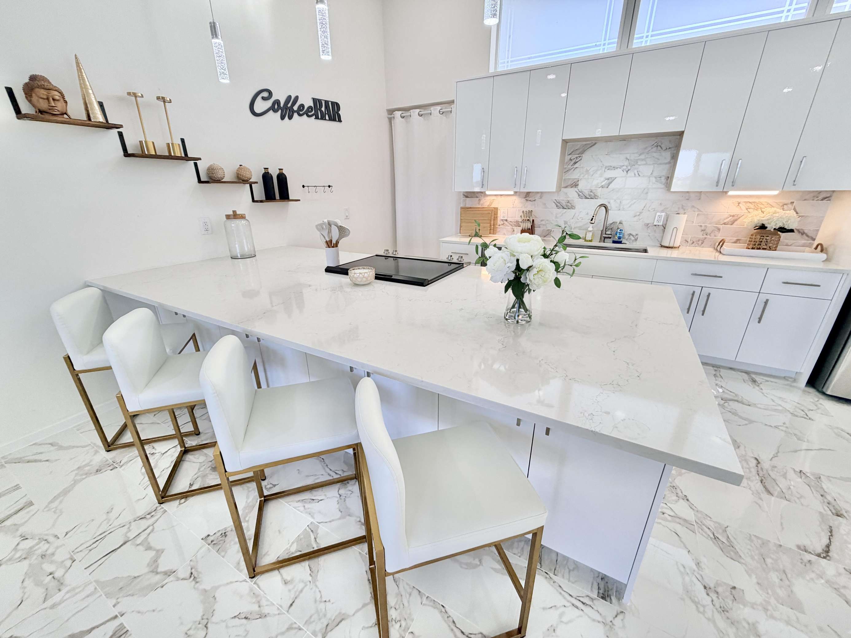Sleek modern kitchen with spacious marble island and seating