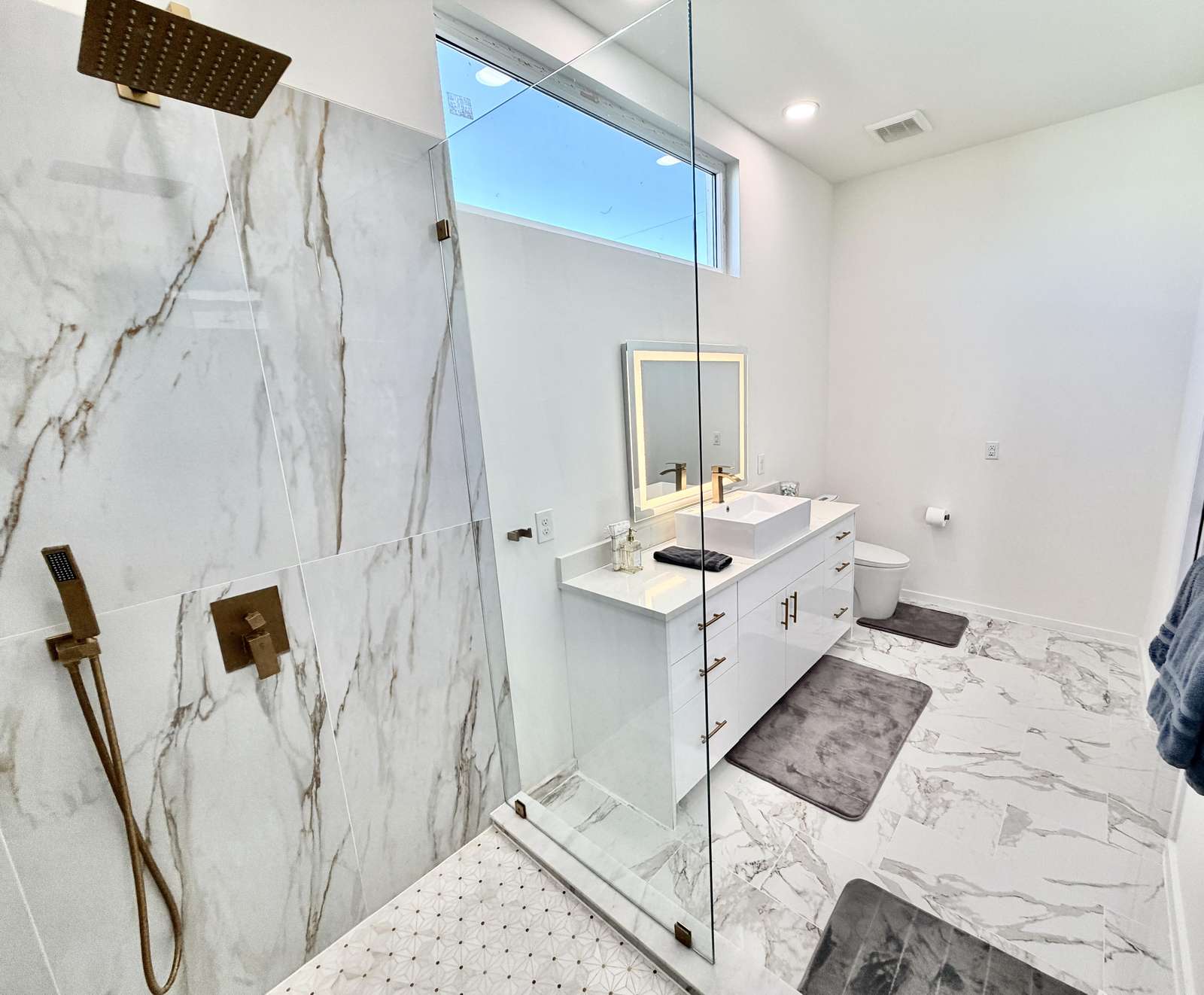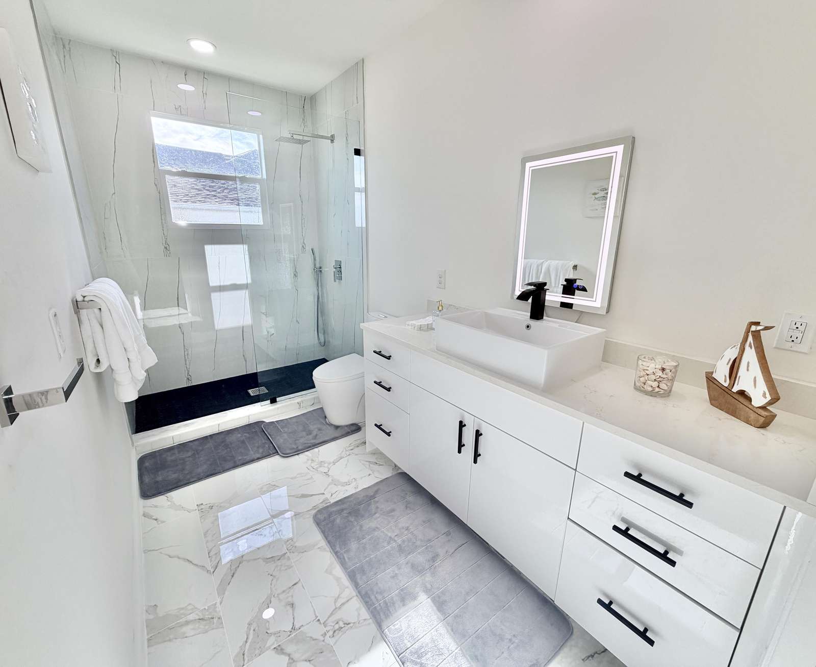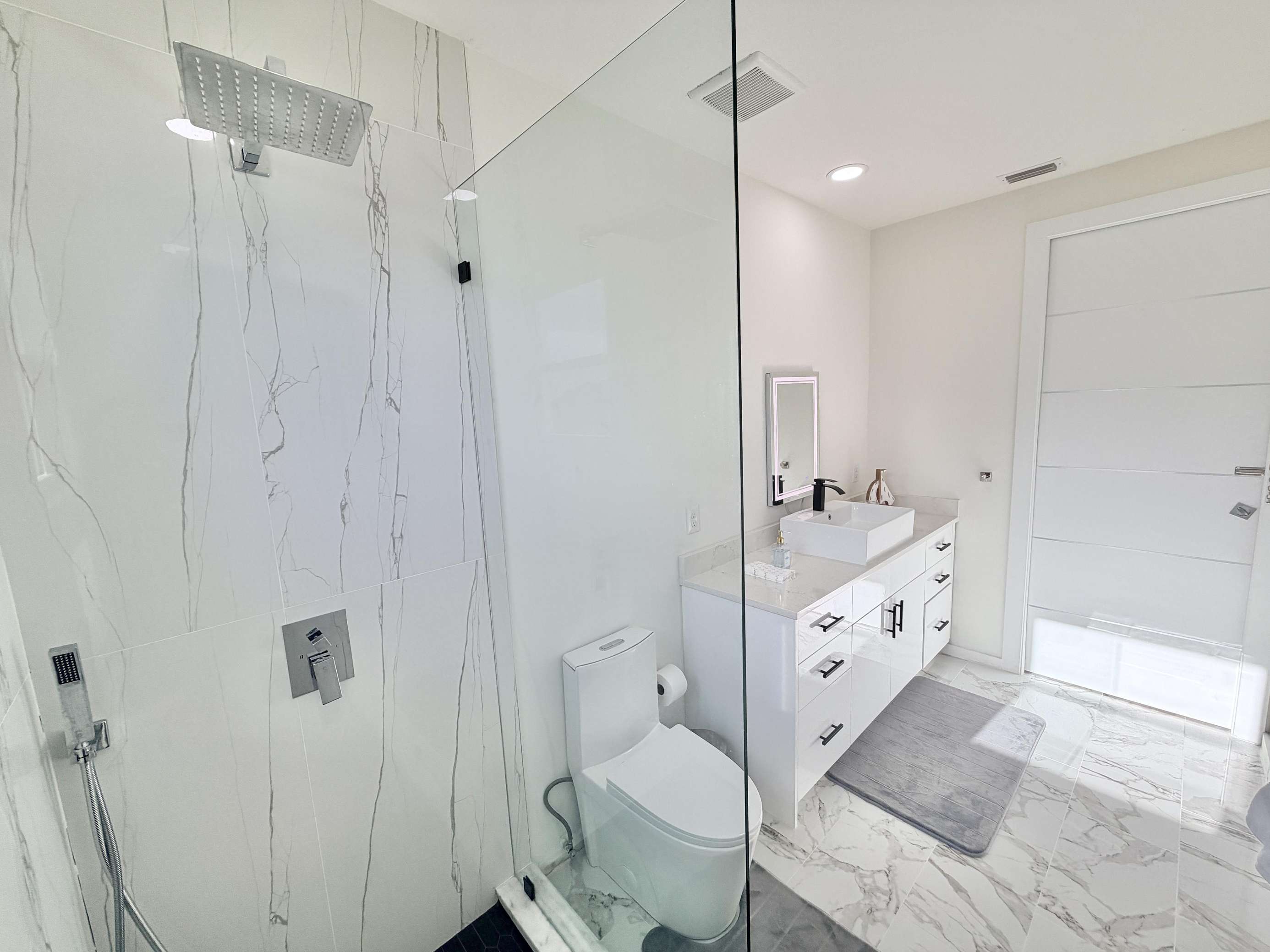 Sleek modern kitchen with spacious marble island and seating